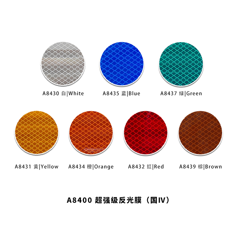 產(chǎn)品顏色有:白/藍(lán)/紅/黃/綠/棕/橙幾個(gè)顏色,反光膜的顏色應(yīng)用場(chǎng)景在國(guó)標(biāo)文件中有明確的要求于注明,如市政交通標(biāo)牌使用反光膜應(yīng)為藍(lán)色做底白色做字膜。景區(qū)旅游標(biāo)識(shí)以棕色作底,白色作字。橙色反光膜顏色較為特殊,警示效果強(qiáng)。一般用于道路施工臨時(shí)交通標(biāo)牌。因?yàn)槌壬垂饽ゎ伾厥馔噬闆r相比別的產(chǎn)品褪色更早。